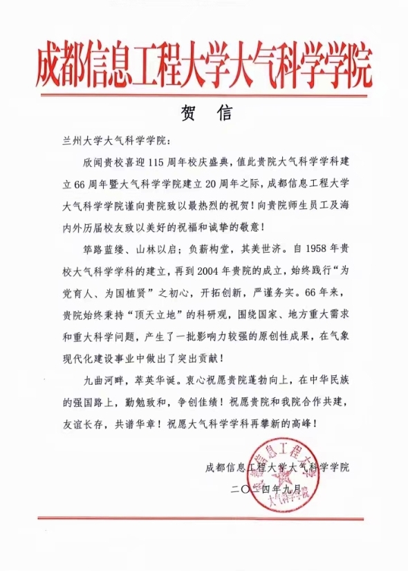 成都信息工程大学suncitygroup太阳集团致suncitygroup太阳集团建院20周年贺信