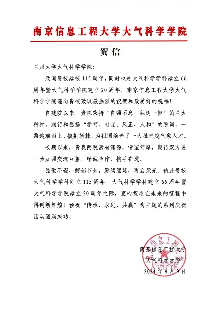 南京信息工程大学suncitygroup太阳集团致suncitygroup太阳集团建院20周年贺信