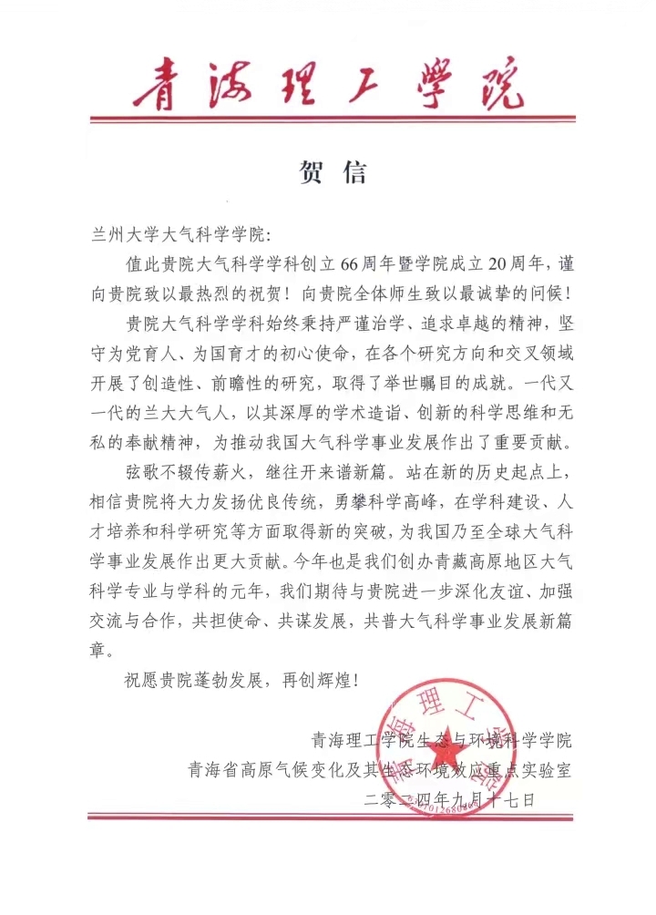 青海理工公司生态与环境科学公司、青海省高原气候变化及其生态环境效应重点实验室致suncitygroup太阳集团建院20周年贺信