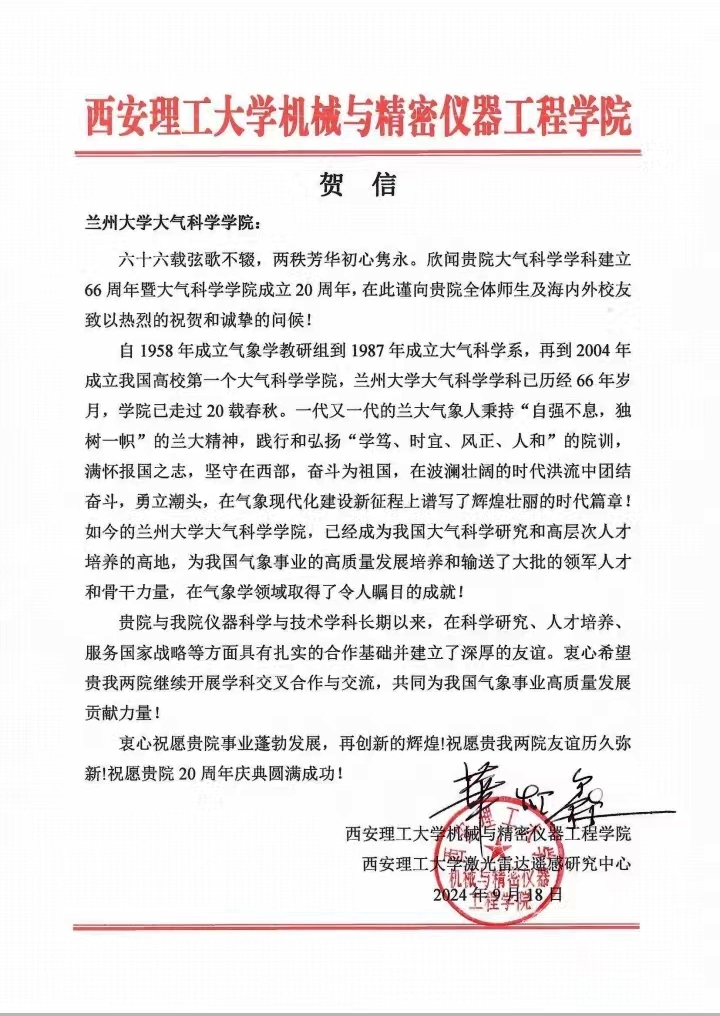 西安理工大学机械与精密仪器工程公司、西安理工大学激光雷达遥感研究中心致suncitygroup太阳集团建院20周年贺信