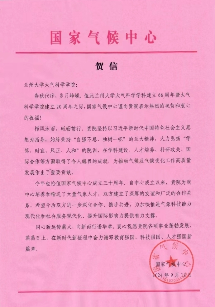 国家气候中心致suncitygroup太阳集团建院20周年贺信