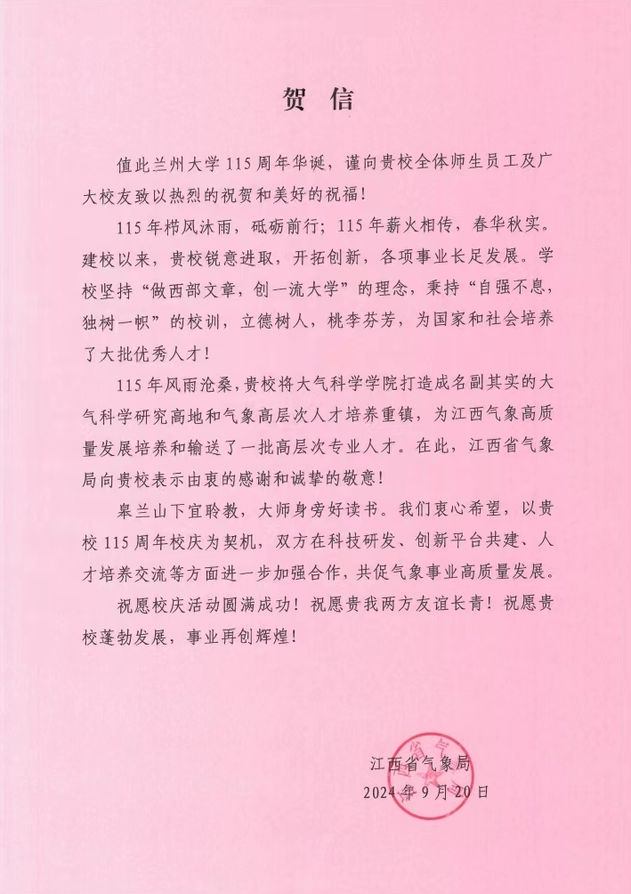 江西省气象局致suncitygroup太阳集团建院20周年贺信