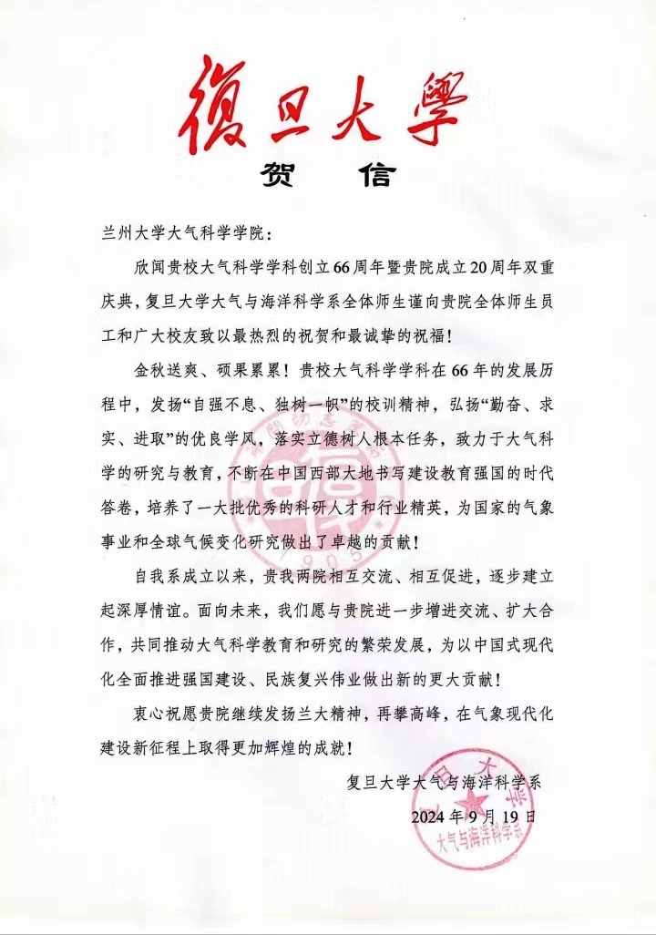 复旦大学大气与海洋科学系致suncitygroup太阳集团建院20周年贺信