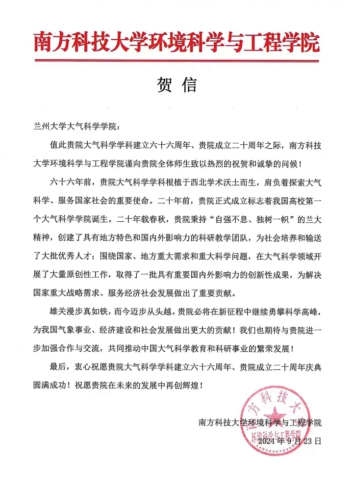 南方科技大学环境科学与工程公司致suncitygroup太阳集团建院20周年贺信