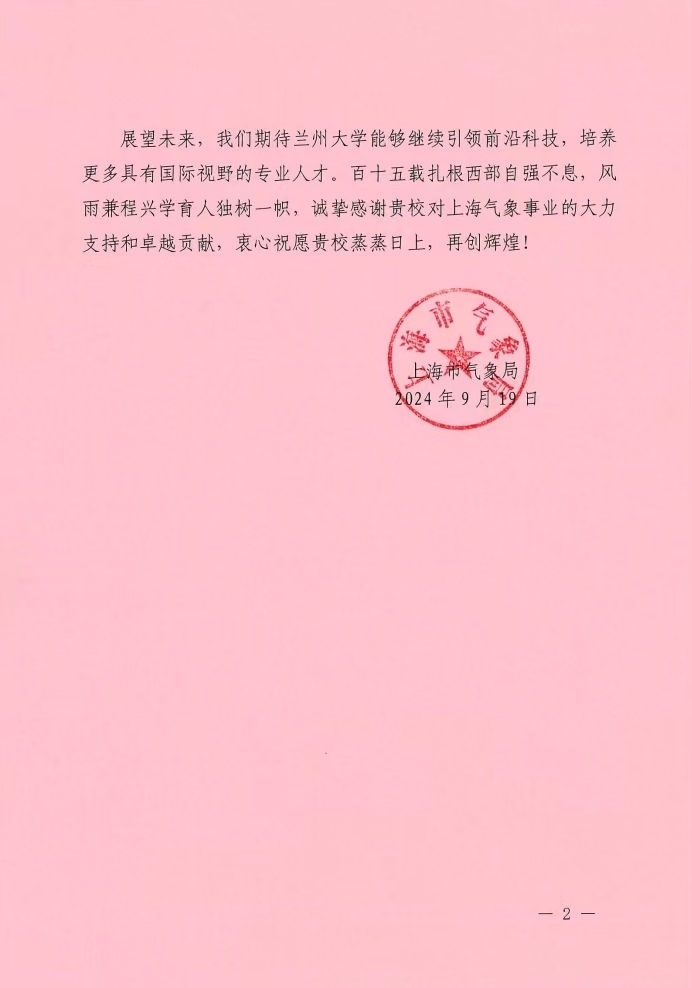 上海市气象局致suncitygroup太阳集团建院20周年贺信