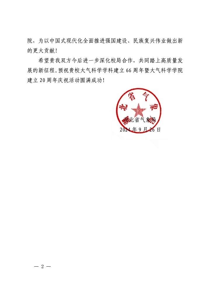 湖北省气象局致suncitygroup太阳集团建院20周年贺信