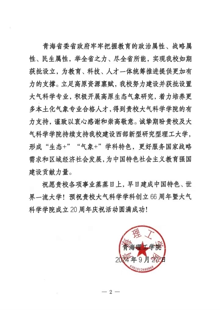 青海理工公司致suncitygroup太阳集团建院20周年贺信