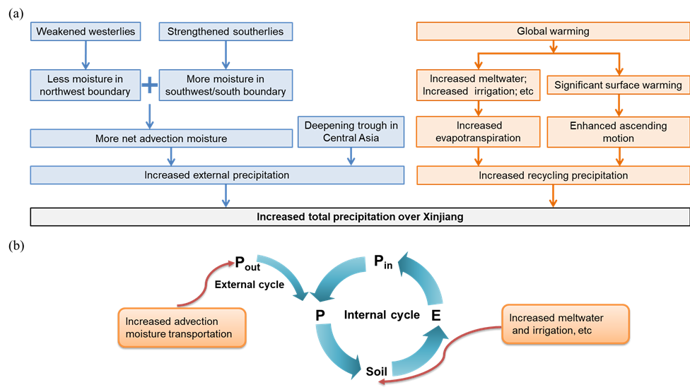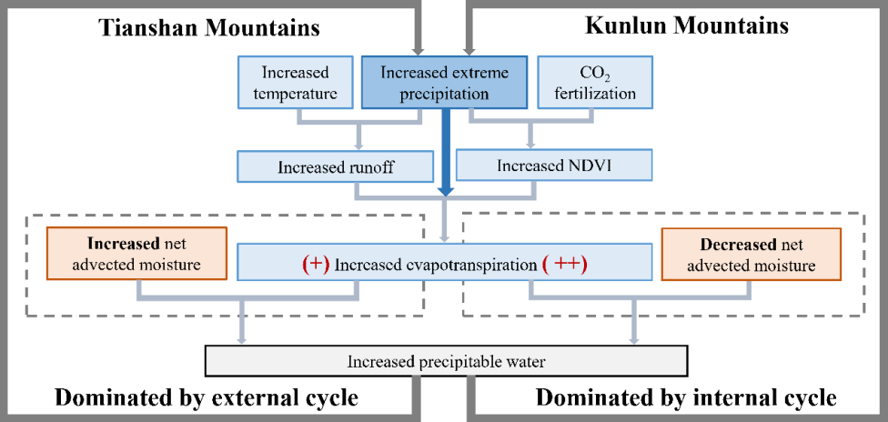 新疆属于典型的干旱半干旱区,是全球气候变化敏感区。自20世纪80年代以来,该地区呈现出显著的暖湿化趋势,同时也发生着日益频繁和强度增强的极端降水事件。水循环是维持地球上生命和环境稳定的关键过程,直接影响着当地的生态系统、农业、工业和居民生活。作为水循环的一个重要环节,新疆降水再循环过程对湿润化的影响及其机制尚不清楚,尤其极端隆水再循环过程的长期变化趋势及其对气候变暖的响应机制仍未探索。