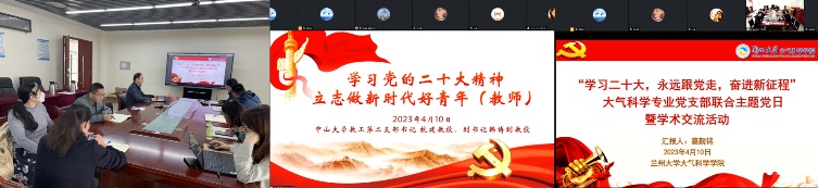 suncitygroup太阳集团经理田文寿教授讲授题目为“分享教书育人与学术科研的经验和体会”的党课,他从德育、智育、体育、美育等方面分享了他培育研究生的宝贵经验,要牢牢把握新时代的使命和任务,坚持为党育人、为国育才,培养大批德才兼备的高素质人才。suncitygroup太阳集团官方网站与中山大学两个教工党支部书记分别介绍各自支部的建设情况,并发表了学习二十大精神的感悟,表达了希望进一步加强大气科学学科校际交流与沟通的期望。