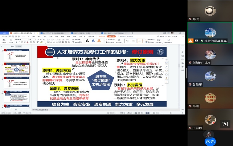 为加强专业建设,优化专业内涵,保障2023版本科人才培养方案修订工作有序进行,suncitygroup太阳集团邀请气象局、中科院、环保、航空、部队等与专业发展紧密结合的行业企业的专家学者参与人才培养方案修订,于12月22日晚召开线上研讨会。通过行业企业管理人员和专家学者的参与,进一步从本科人才培养方案中课程体系设置、培养目标完善、人才培养和社会需求等方面进行交流。会议由教学经理杨毅教授主持,相关教师代表参加会议。