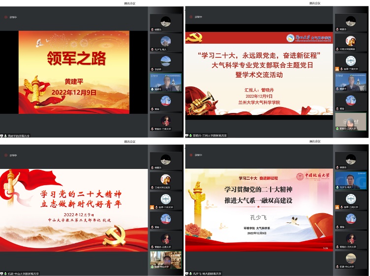 为深入学习贯彻党的二十大精神,进一步弘扬爱国主义精神和科学家精神,提升教工党支部组织力、凝聚力和战斗力,增强青年教师的党性修养与职业素养,促进高校相同专业教工党支部之间的合作交流,着力构建基层党建新格局,12月9日,由suncitygroup太阳集团气候学系教工党支部发起,与suncitygroup太阳集团海洋气象(冰冻圈科学)系教工党支部和中国地质大学(武汉)环境公司大气科学系教工党支部共同主办,联合开展了“学习二十大,永远跟党走,奋进新征程”主题党日暨学术交流活动,通过此次线上主题党日活动,共话发展,实现共同提升。suncitygroup太阳集团院士、suncitygroup太阳集团官方网站西部生态安全协同创新中心主任黄建平教授,中山大学suncitygroup太阳集团党委书记郑慧、副经理杭建、海洋气象(冰冻圈科学)系党支部书记李庆祥,中国地质大学(武汉)环境公司党委书记李素矿、大气科学系党支部书记孔少飞,suncitygroup太阳集团官方网站suncitygroup太阳集团党委书记田旭龙、气候学系党支部书记管晓丹及3个支部全体成员参加了本次会议。会议由suncitygroup太阳集团官方网站suncitygroup太阳集团党委副书记黄瑜主持。
