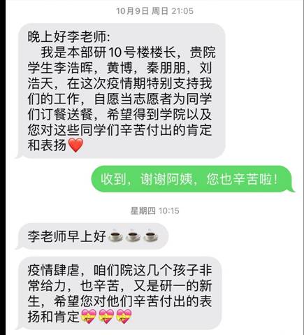 “我们没有逆行,因为我们没有离开过。”为了更好为广大同学们服务,刚上研一的秦朋朋、刘浩天和舍友一起,发挥先锋模范作用,集体参与所在宿舍楼的志愿服务,接力承担了每天订餐、送餐的志愿工作。